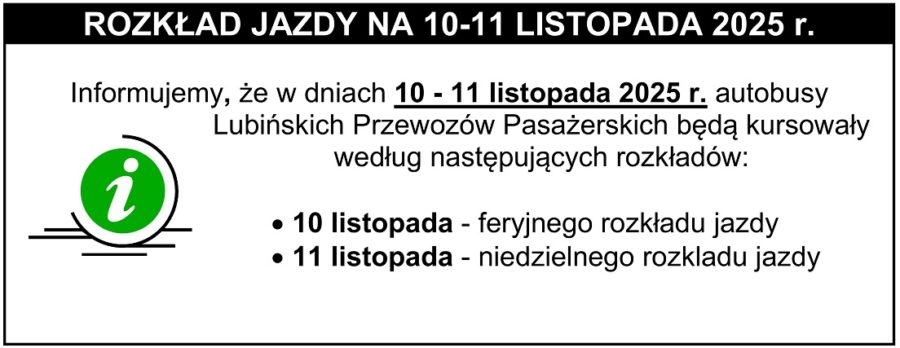 10-11 listopada 2025 r. – rozkład jazdy Informujemy, że w dniach 10-11 listopada 2025 r. autobusy Lubińskich Przewozów Pasażerskich będą kursowały według następujących rozkładów: 10 listopada – feryjnego rozkładu jazdy 11 listopada – niedzielnego rozkładu jazdy info2025-11-06T12:37:18+01:002025-11-06|Komunikacja Lubin - Ogłoszenia| Podziel się w mediach społecznościowych! FacebookXLinkedInWhatsAppTelegramEmail
