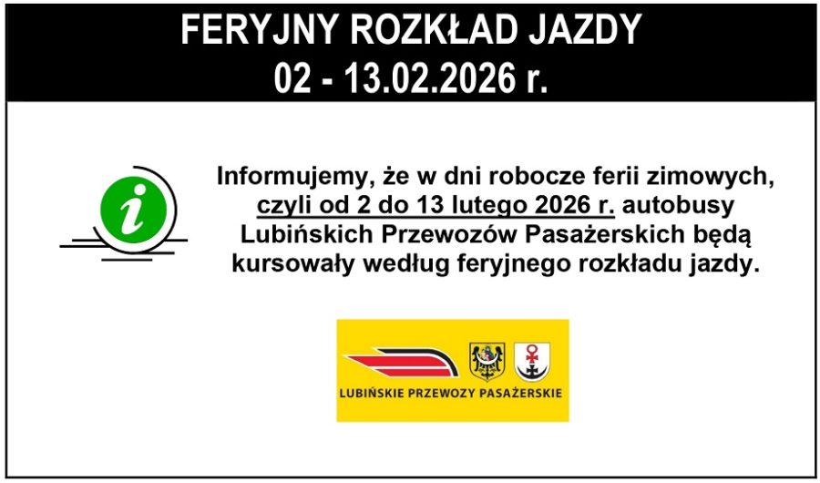 Feryjny rozkład jazdy Informujemy, że w dni robocze ferii zimowych, czyli od 2 do 13 lutego 2026 r. autobusy Lubińskich Przewozów Pasażerskich będą kursowały według feryjnego rozkładu jazdy. info2026-01-29T08:20:32+01:002026-01-29|Komunikacja Lubin - Ogłoszenia| Podziel się w mediach społecznościowych! FacebookXLinkedInWhatsAppTelegramEmail