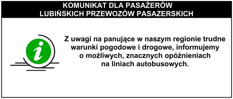 Pilne!! – 05 luty 2026 r. Z uwagi na panujące w naszym regionie trudne warunki pogodowe i drogowe, informujemy o możliwych, znacznych opóźnieniach na liniach autobusowych. info2026-02-05T09:07:10+01:002026-02-05|Komunikacja Lubin - Ogłoszenia| Podziel się w mediach społecznościowych! FacebookXLinkedInWhatsAppTelegramEmail