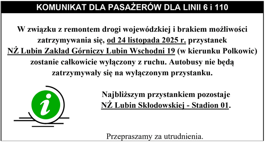 W związku z remontem drogi wojewódzkiej i brakiem możliwości zatrzymywania się, od 24 listopada 2025 r. przystanek NŻ Lubin Zakład Górniczy Lubin Wschodni 19 (w kierunku Polkowic) zostanie całkowicie wyłączony z ruchu. Autobusy nie będą zatrzymywały się na wyłączonym przystanku. Najbliższym przystankiem pozostaje NŻ Lubin Skłodowskiej – Stadion 01.
